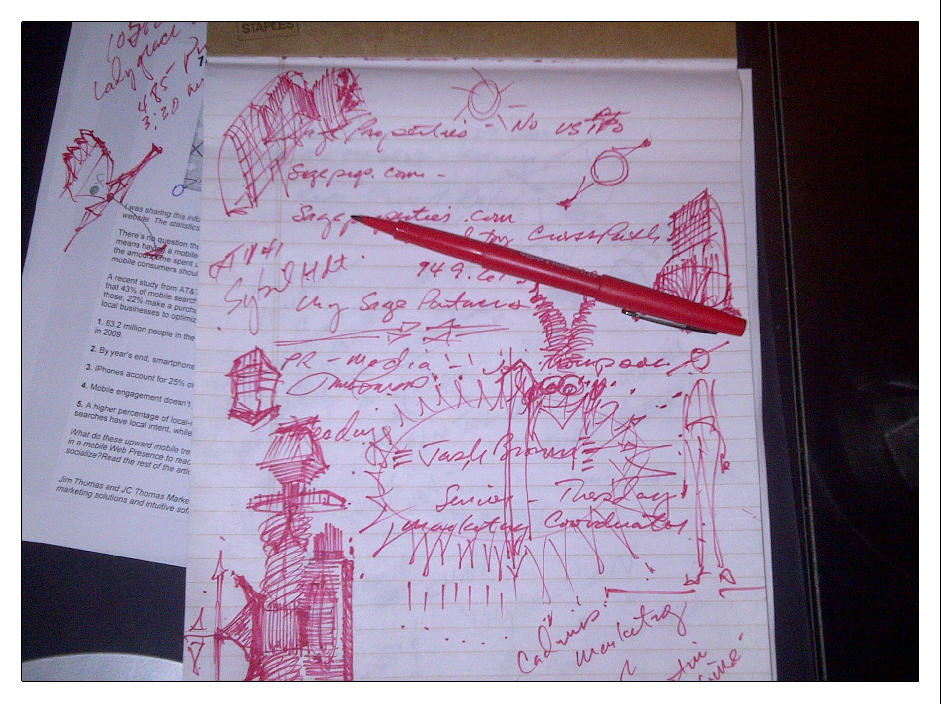 Being a voracious doodler, I have always been self-conscious in the board room. I always fear that I might be viewed as not paying attention to the task at hand as I scrawl images on my legal pad. No matter how I try to keep my red Flair pen at bay, it always gets the best of me. (See the picture below from an internal meeting where we developed marketing concepts for an NC-based restaurant company.)